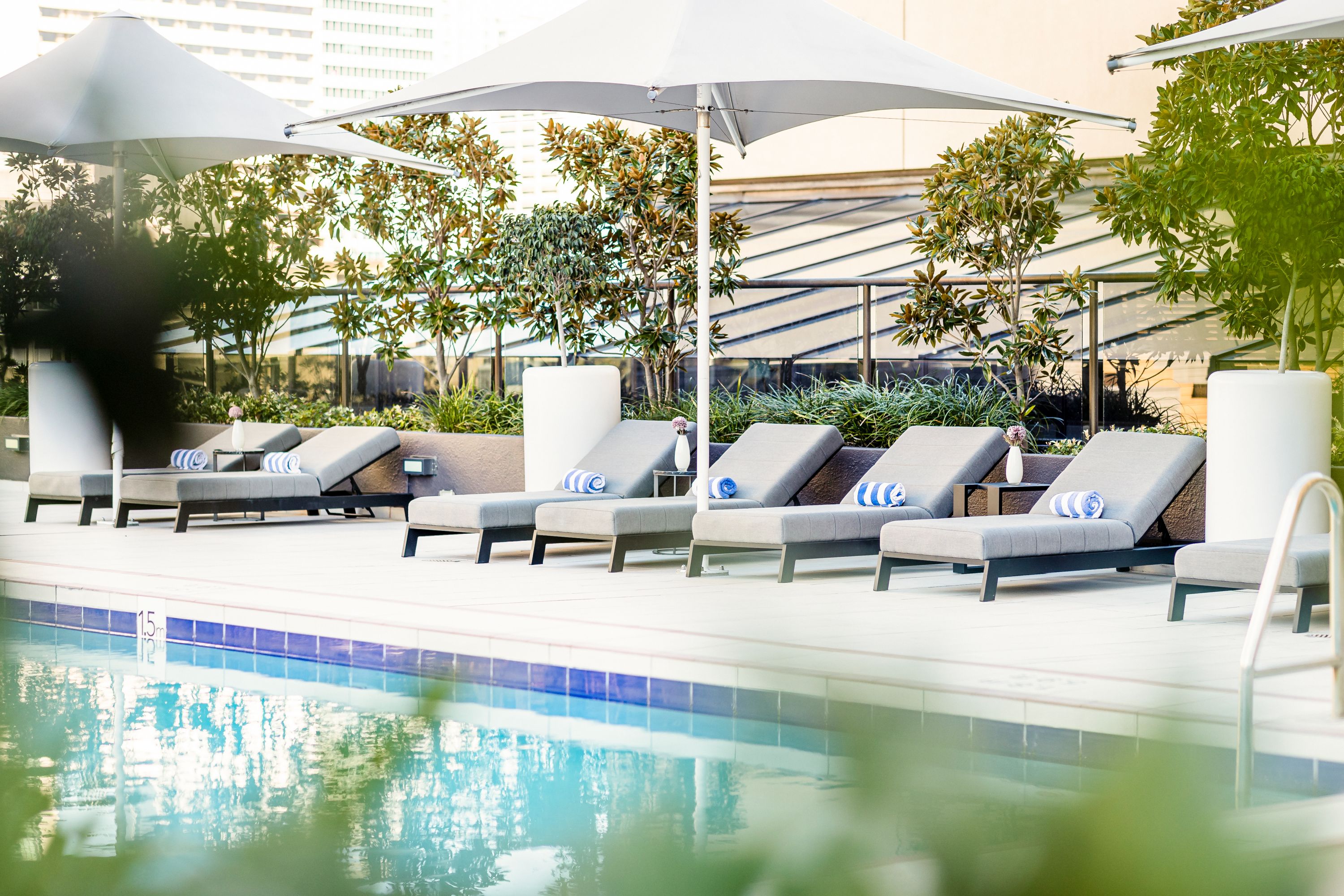 Unsere Poolterrasse ist eine urbane Oase mit einem von glänzenden Hochhäusern umgebenen Whirlpool. Sie sind hungrig? Dank des Service am Pool können Sie köstliche Snacks und Getränke auf Ihrer Liege genießen.