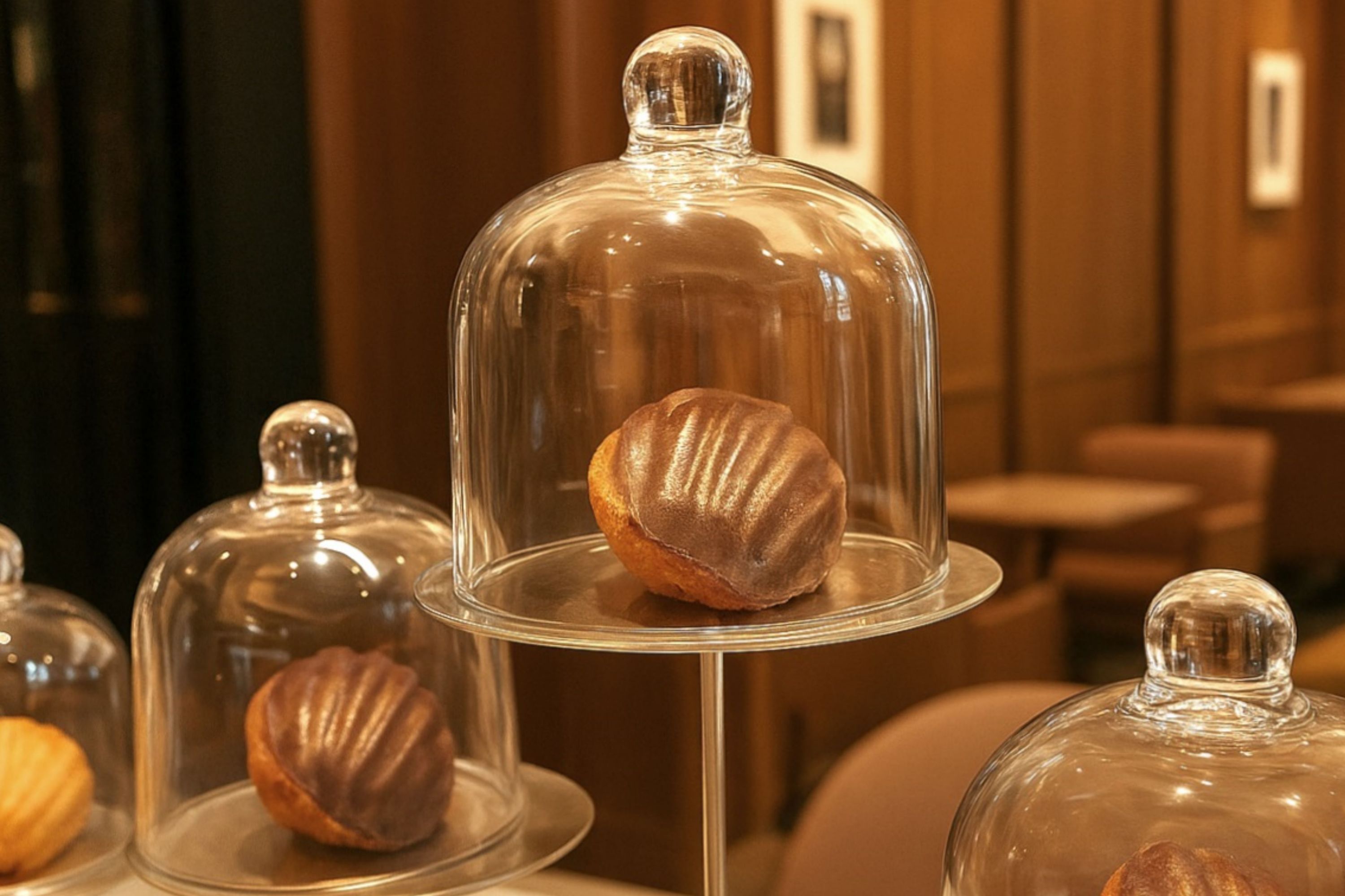 Indulge in a silky hot chocolate or in the refined pleasure of our crafted cocktails, perfectly paired with exquisite madeleines adorned with golden accents.