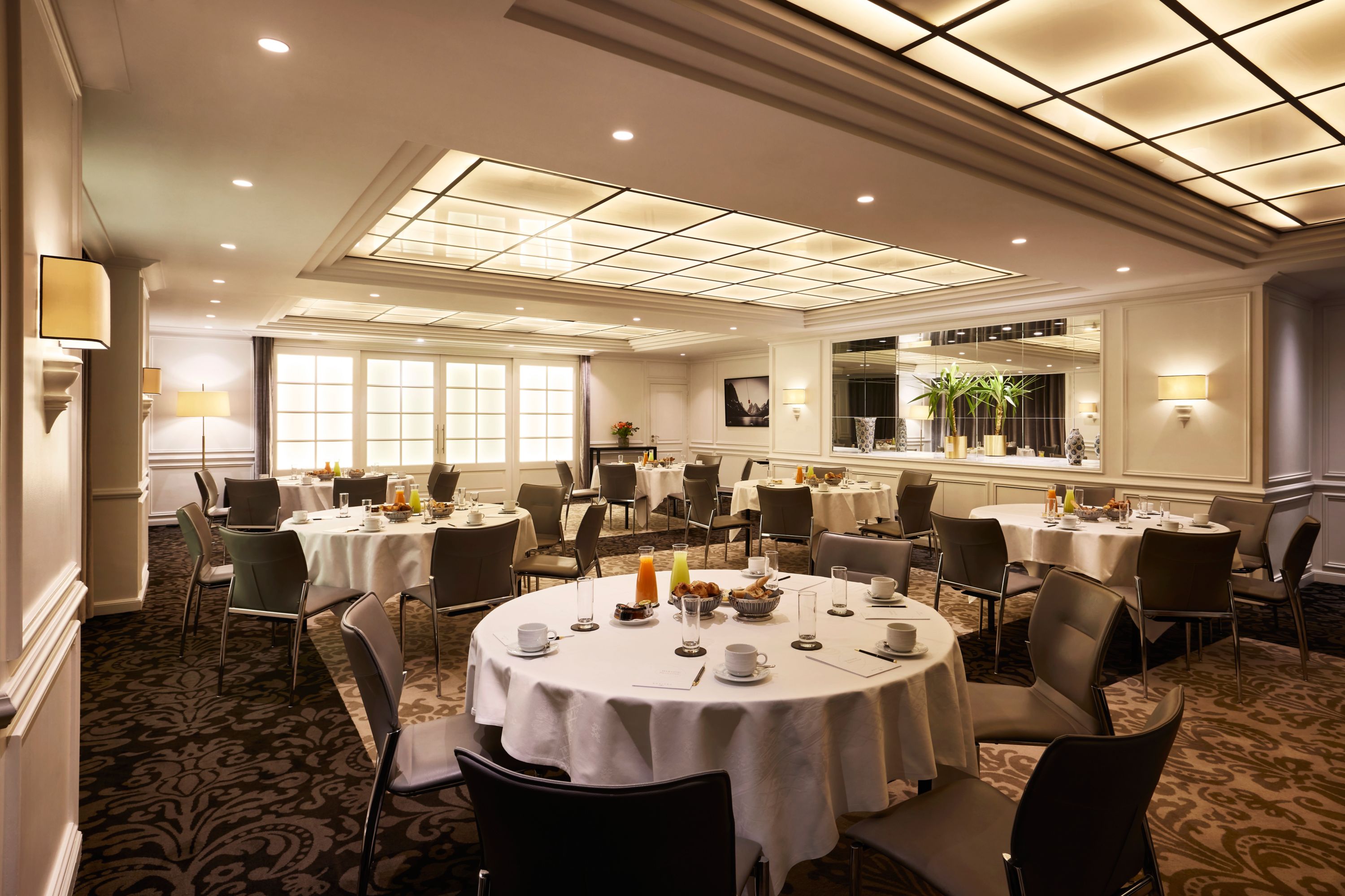 A light-filled room in muted tones, where noble furnishings and opulent contemporary pieces blend elegantly. This exclusive setting is ideal for events for up to 18 people.
