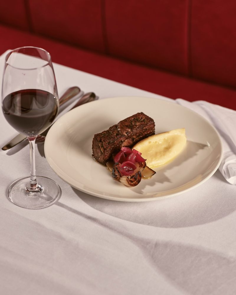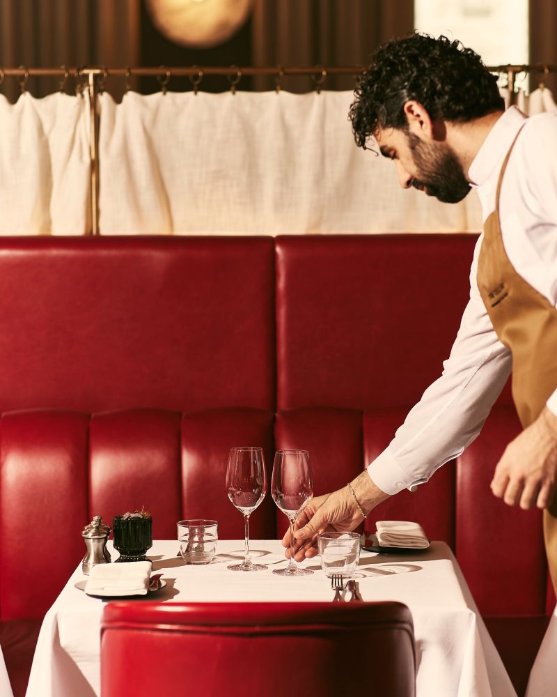 Drop-in for a glass of wine or cocktail with charcuterie and snacks after work, an informal business lunch, ideal pre/post-theatre dining, or a convivial evening with friends. Whether at the counter, ideal for solo diners, or on one of the richly-coloured red leather banquettes, our charming brasserie-style restaurant prides itself on the quality of its warm hospitality and great food and drink.