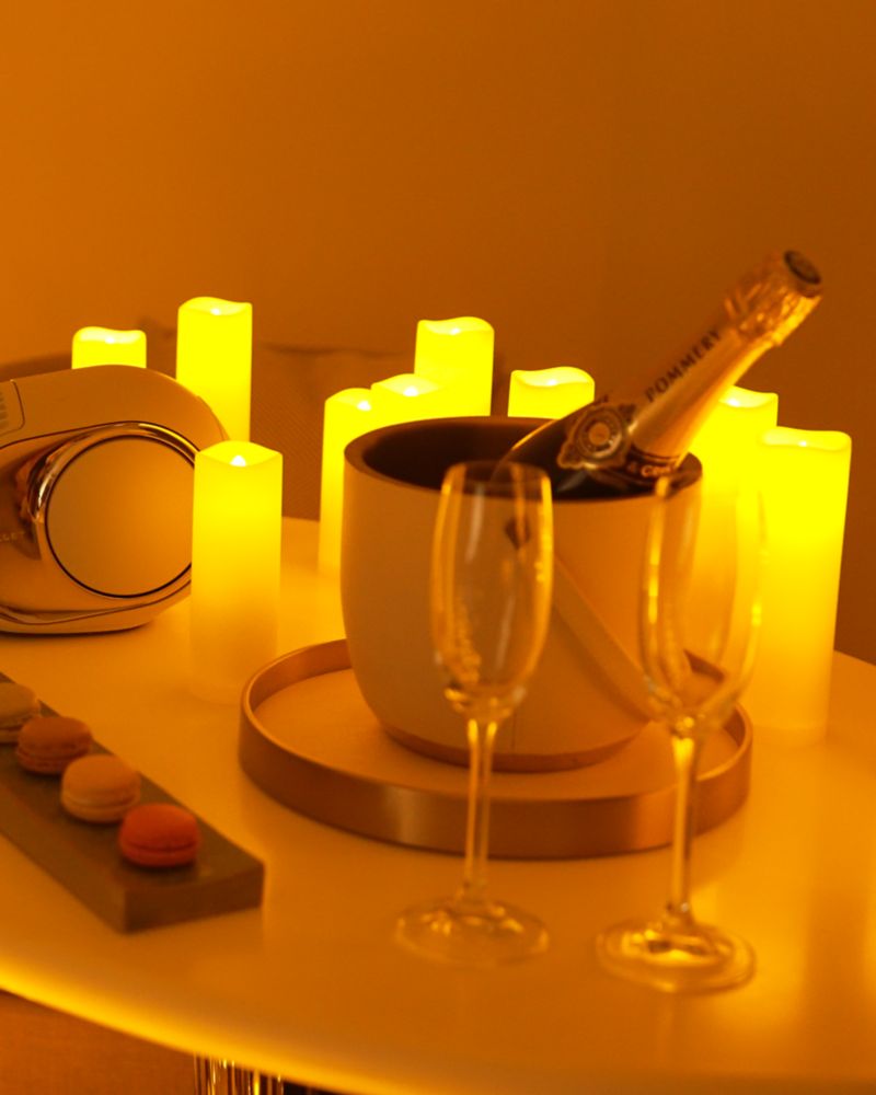 Immerse yourself in a sensorial escape as your room is beautifully bathed in the warm glow of candlelight. Soothe your mind and elevate your spit with a specially curated playlist of smooth melodies, played through a Devialet speaker - renowned for it's compact design and exceptional, ultra-precise sound. Experience serenity and celebrate the 2025 festive season in an enchanting candle-lit ambiance.