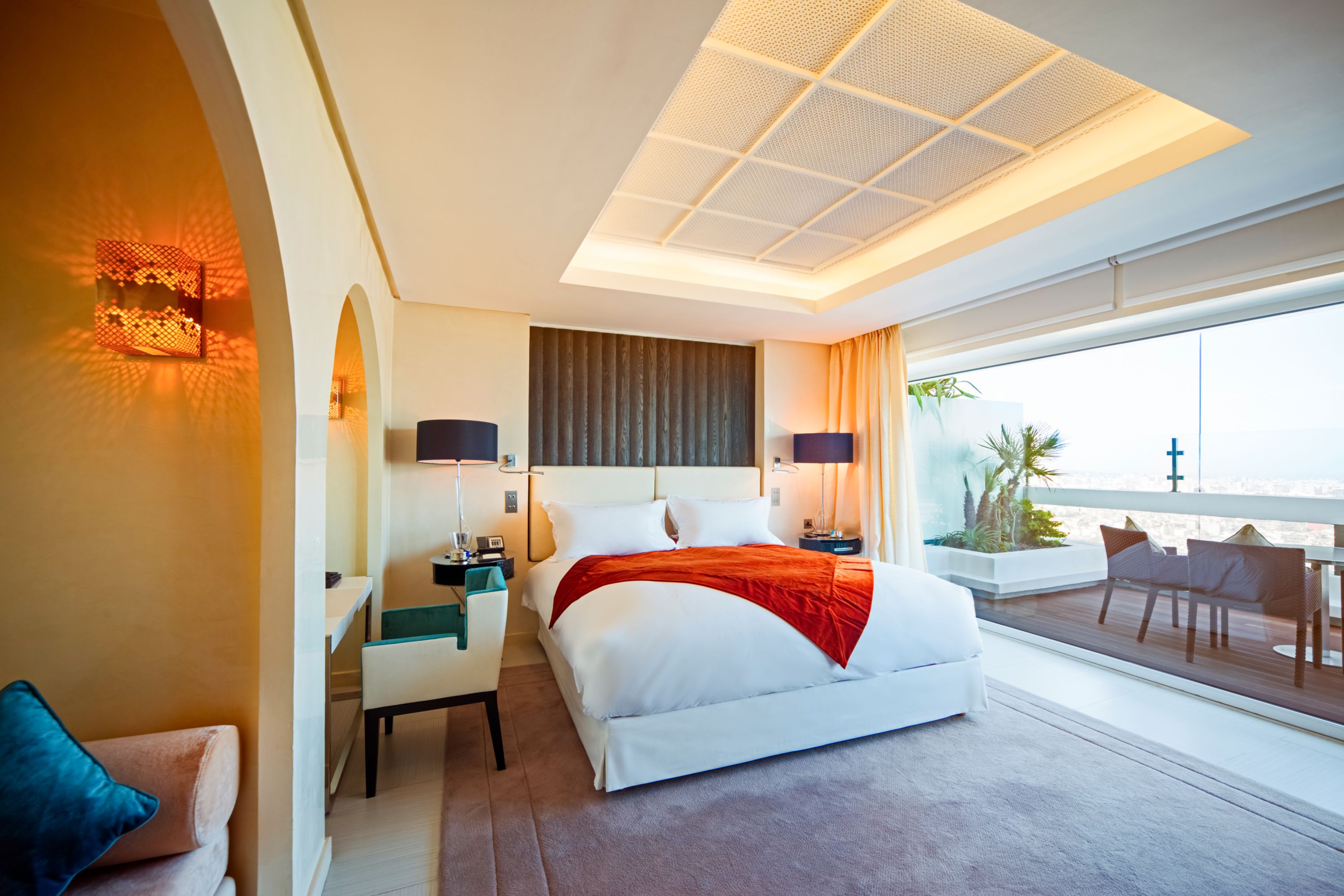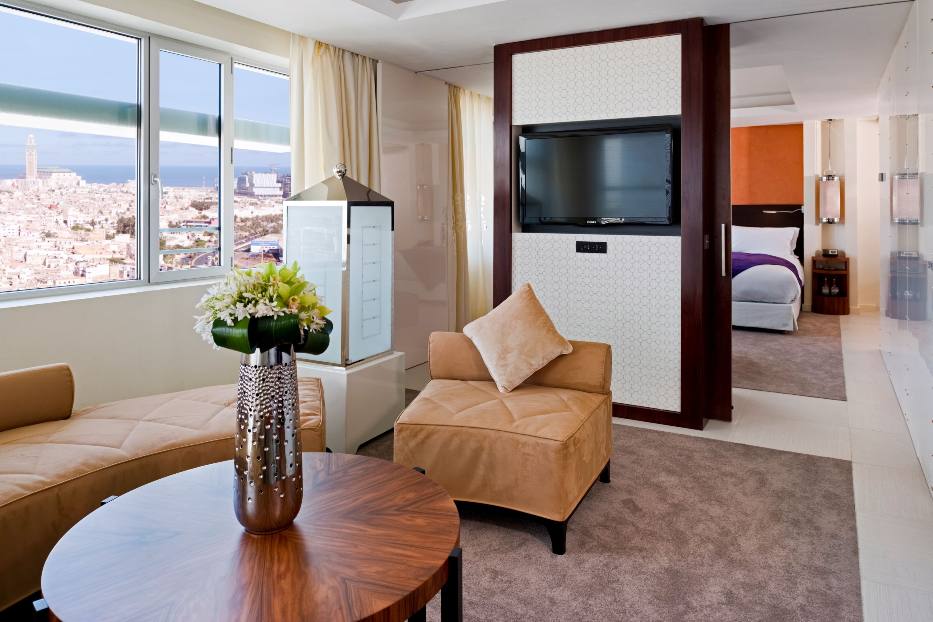 PRESTIGE SUITE, KING SIZE BED, SEPARATE LOUNGE, VIEW OF THE MEDINA, HASSAN II MOSQUE AND OCEAN