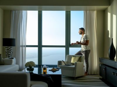At Sofitel Abu Dhabi Corniche, elegant design is inspired by the natural beauty of the Emirates. The sea-themed lobby features a jellyfish-inspired chandelier, wave-like ceiling beams, and an oyster shell–finish Concierge Desk. Fluted columns echo the Louvre, while dark flooring evokes waves beneath a starry sky—blending Emirati nature influences with timeless French sophistication.