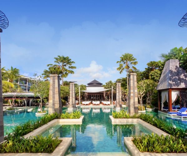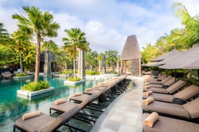 But the Bali of today is changing. The backpacker trail of thatched beach bars and fan-cooled bungalows still exists, but you’ll find architectural innovation too: villas that disappear into jungle canopy, hotels in Bali built around Hindu philosophy, dining rooms suspended above aquariums. At Sofitel Bali Nusa Dua, guests arrive through terraced gardens modelled on rice paddies, passing towering statues and intricate wood carvings before reaching an open-air lobby crowned by a carved Circle of Life ceiling.