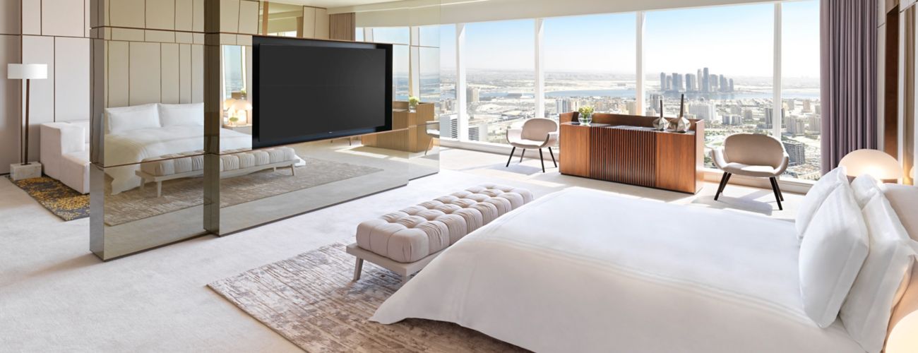 The hotel’s prime location makes it the perfect base for exploring nearby landmarks like the Louvre Abu Dhabi, strolling through the serene mangroves, or enjoying sunset cocktails and Arabic tunes at the exclusive Jazz & Fizz Bar. Rooms are designed as tranquil retreats, featuring soft pastel hues and plush bedding, ensuring a restful stay.