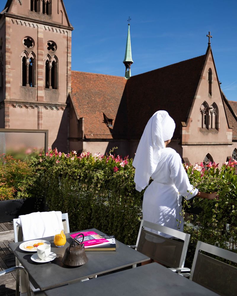 Nelle giornate di sole, il brunch viene servito sulla nostra elegante terrazza colorata, impreziosita da alberi di limoni, un rifugio sereno e raffinato situato nel cuore di Strasburgo.