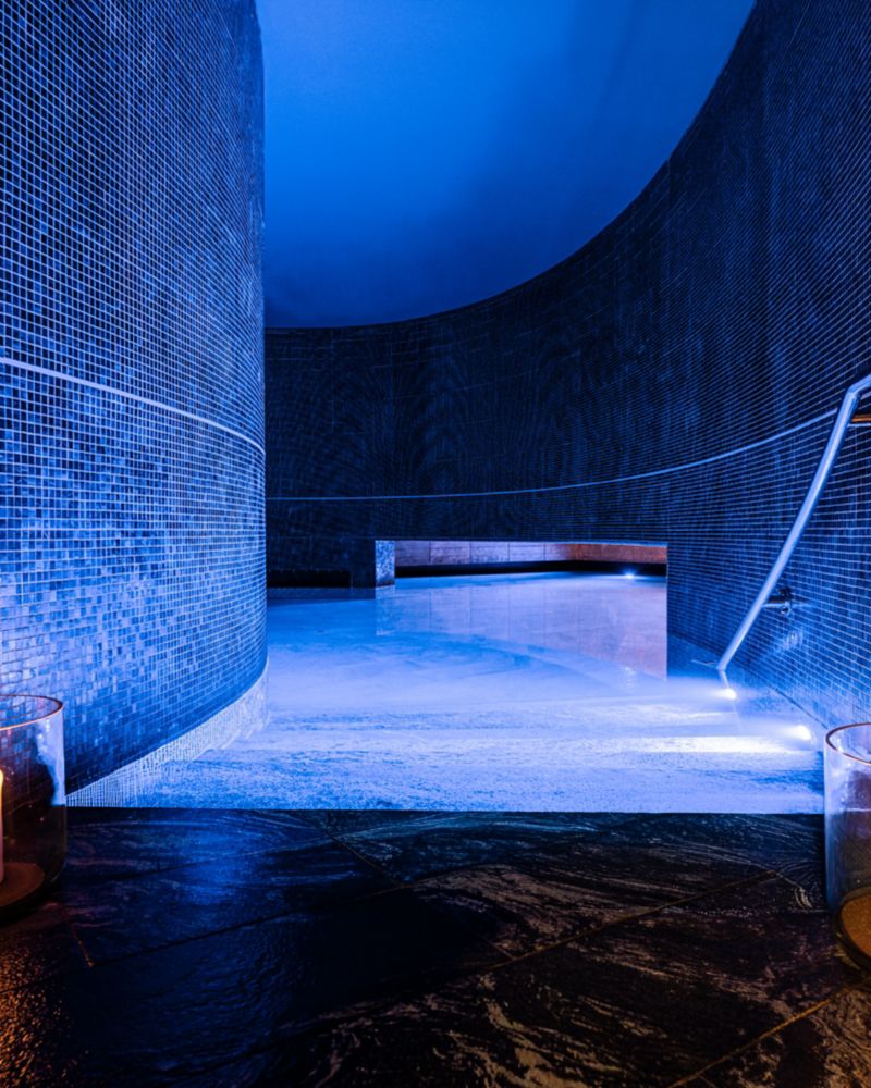 Desça degraus suaves até a água, banhe-se em bolhas efervescentes na banheira de hidromassagem e, depois, flutue tranquilamente em um casulo de jade até uma câmara oculta onde você pode se alongar em um momento de lazer secreto.