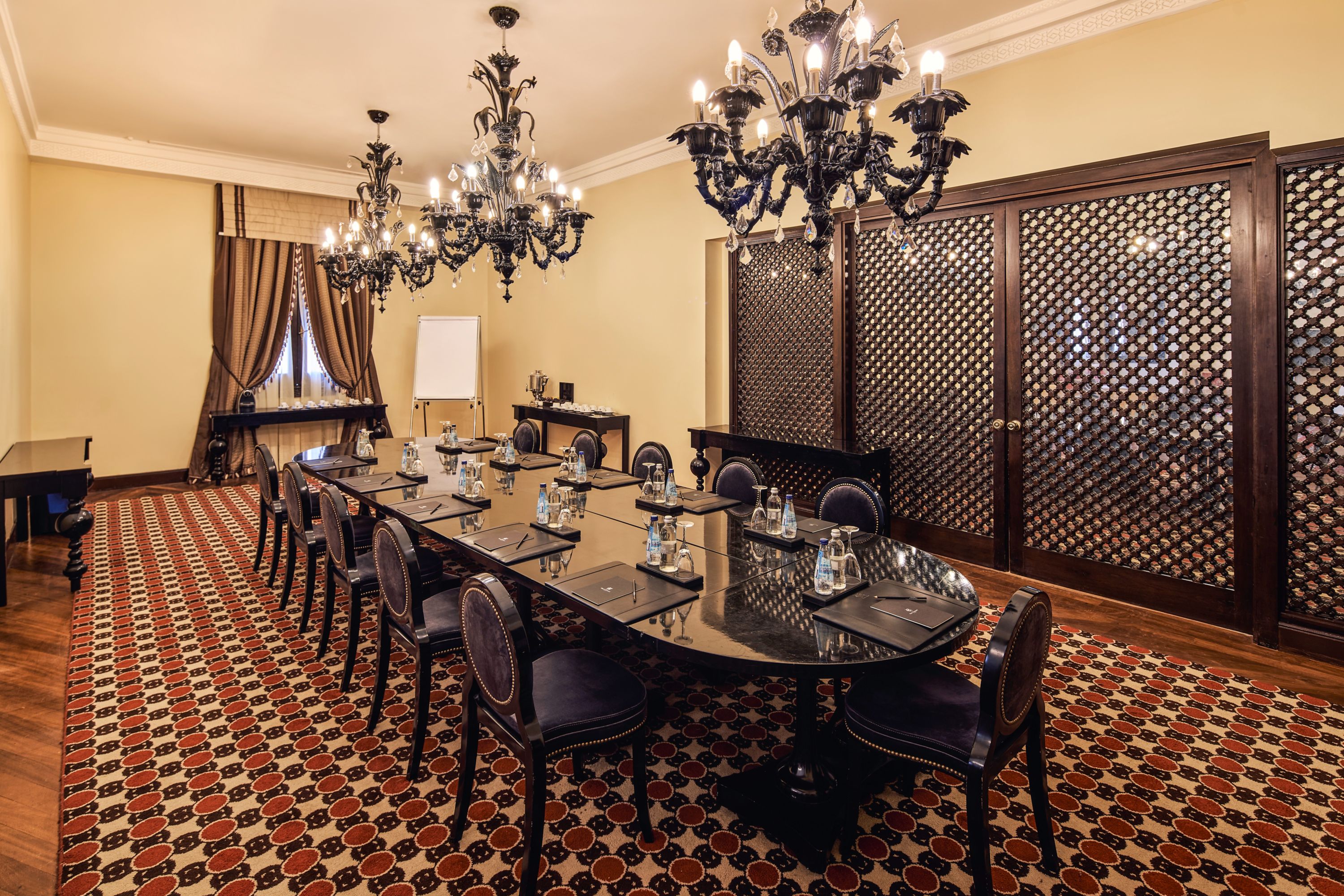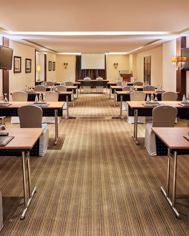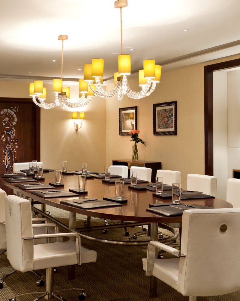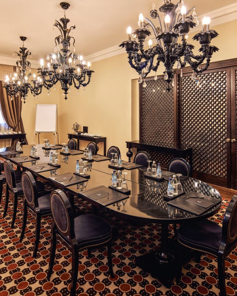 柔和棕色、自然光、高耸的天花板和奢华吊灯共同构成这一致敬当地人的厅室。电视会议设备助您确保活动顺利执行。