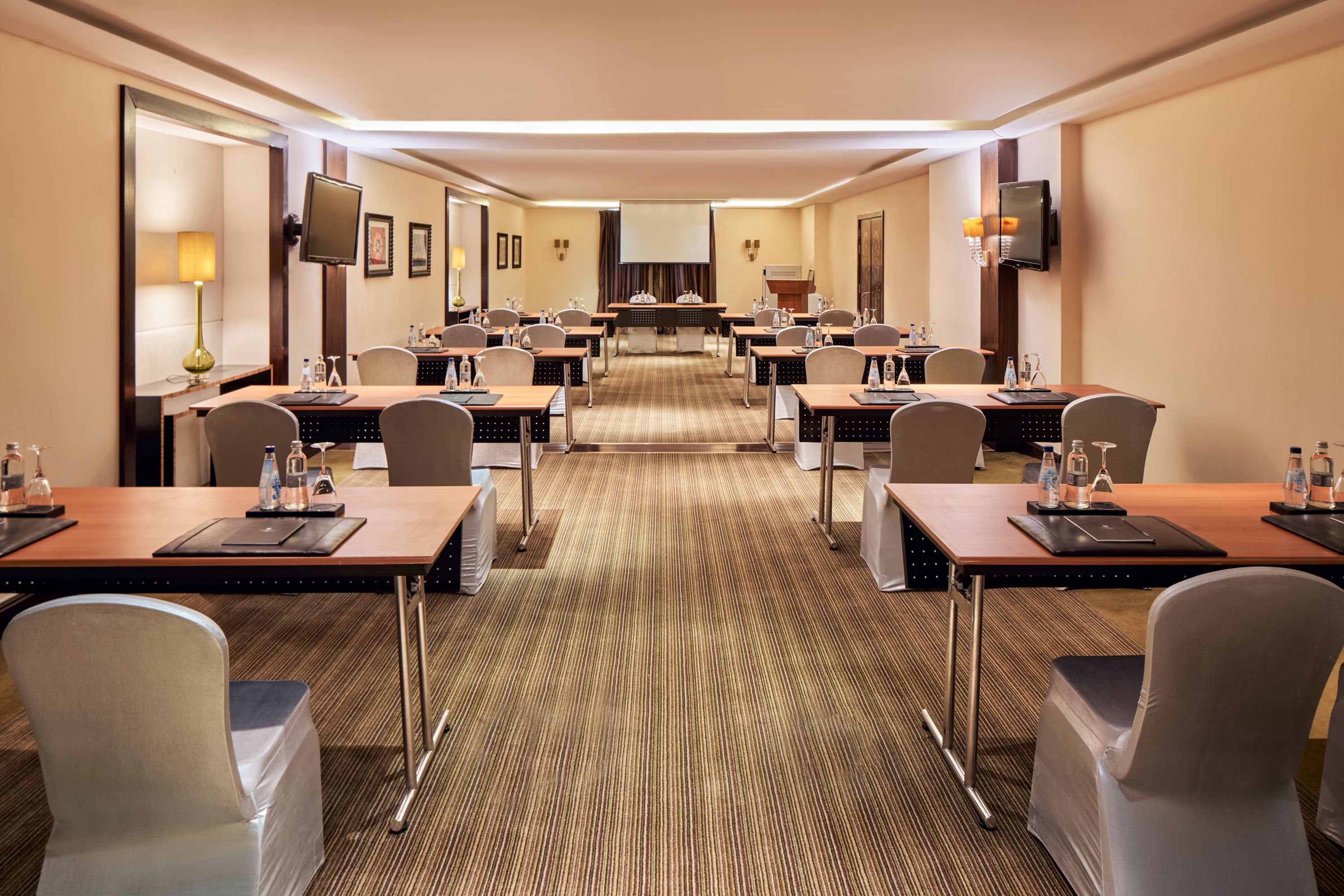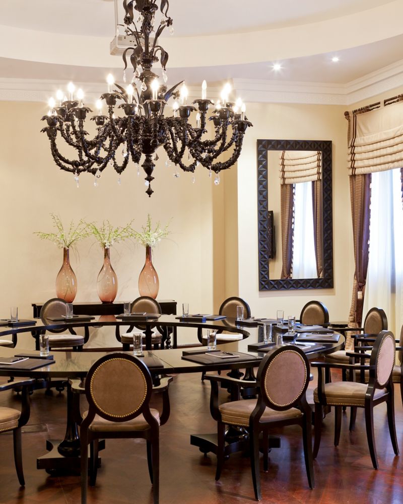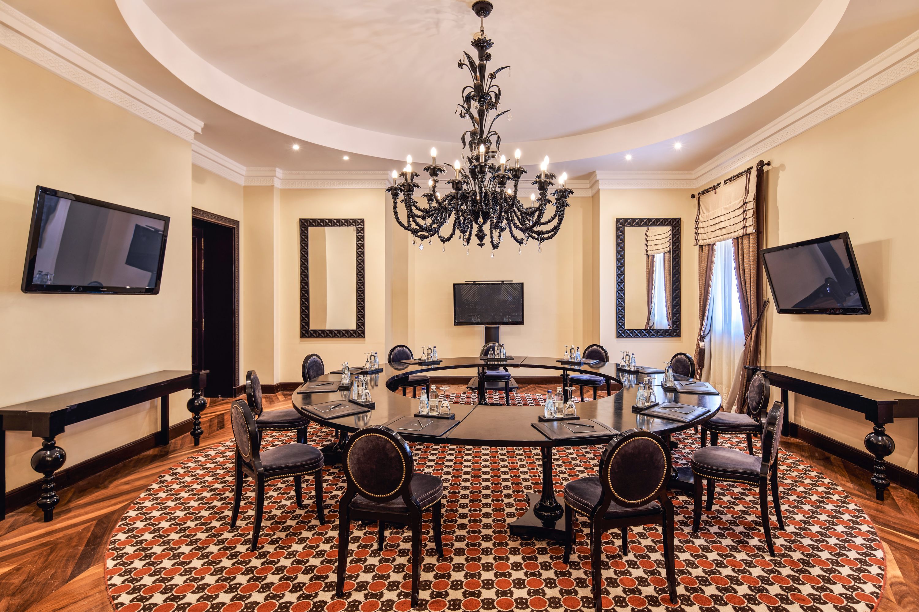 柔和棕色、自然光、高耸的天花板和奢华吊灯共同构成这一致敬当地人的厅室。电视会议设备助您确保活动顺利执行。