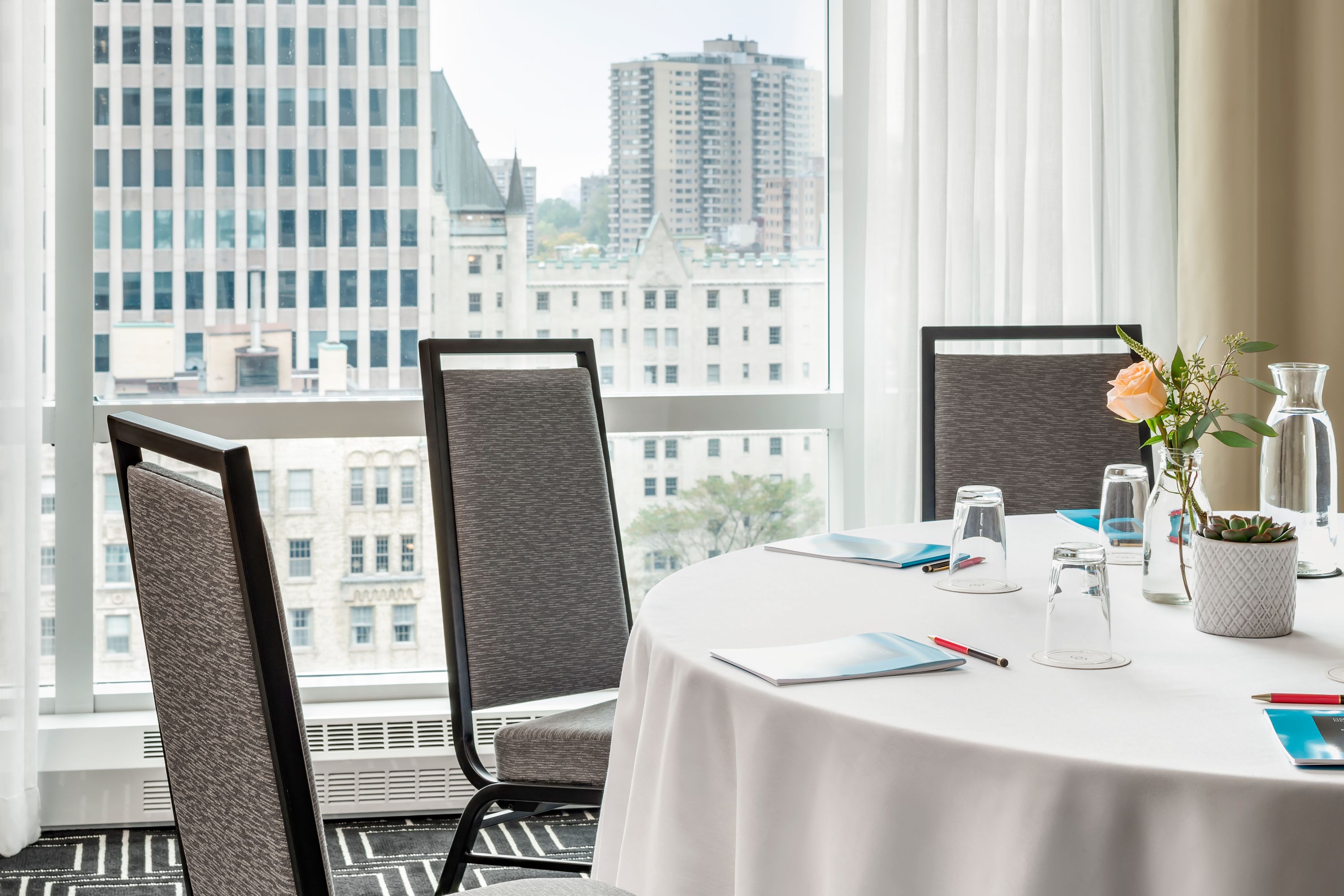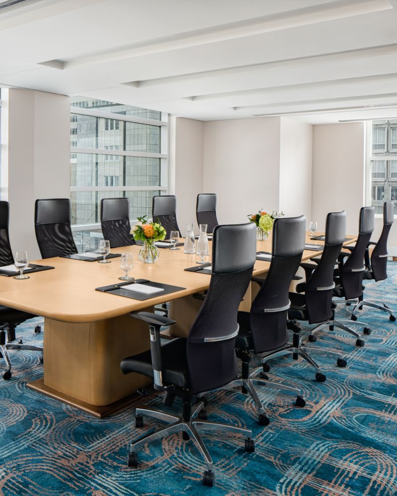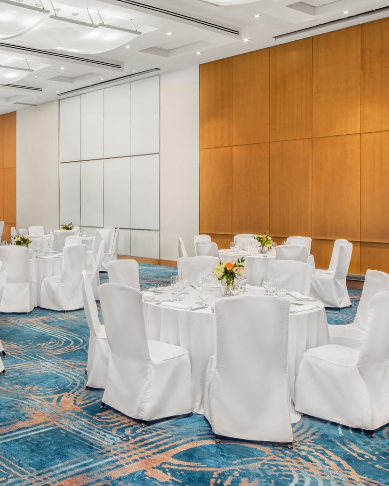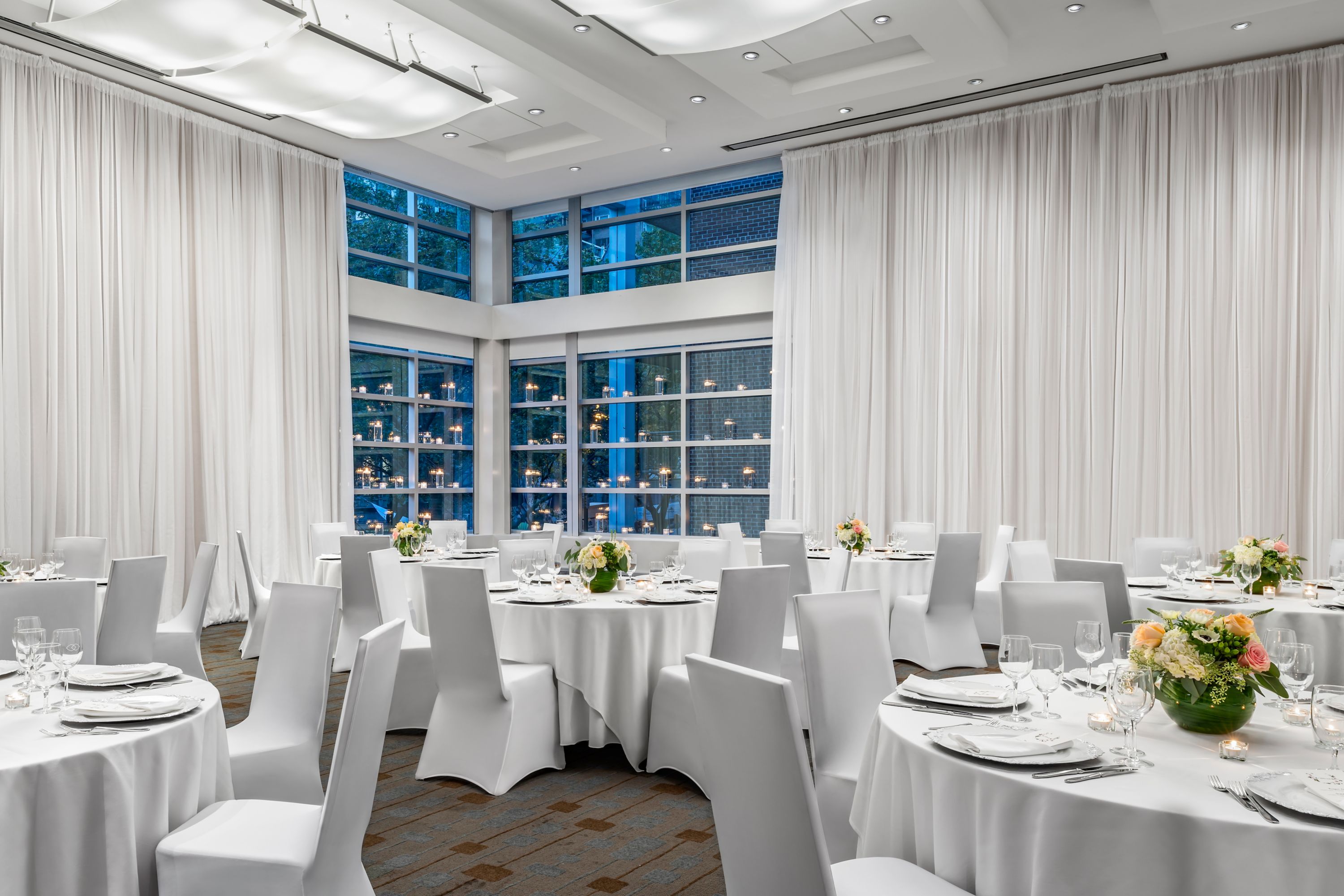 这个小型宴会厅可举办梦幻般的婚礼或招待会,亦可划分成两个会议空间使用。从落地窗眺望,可越过树梢欣赏城市美景。