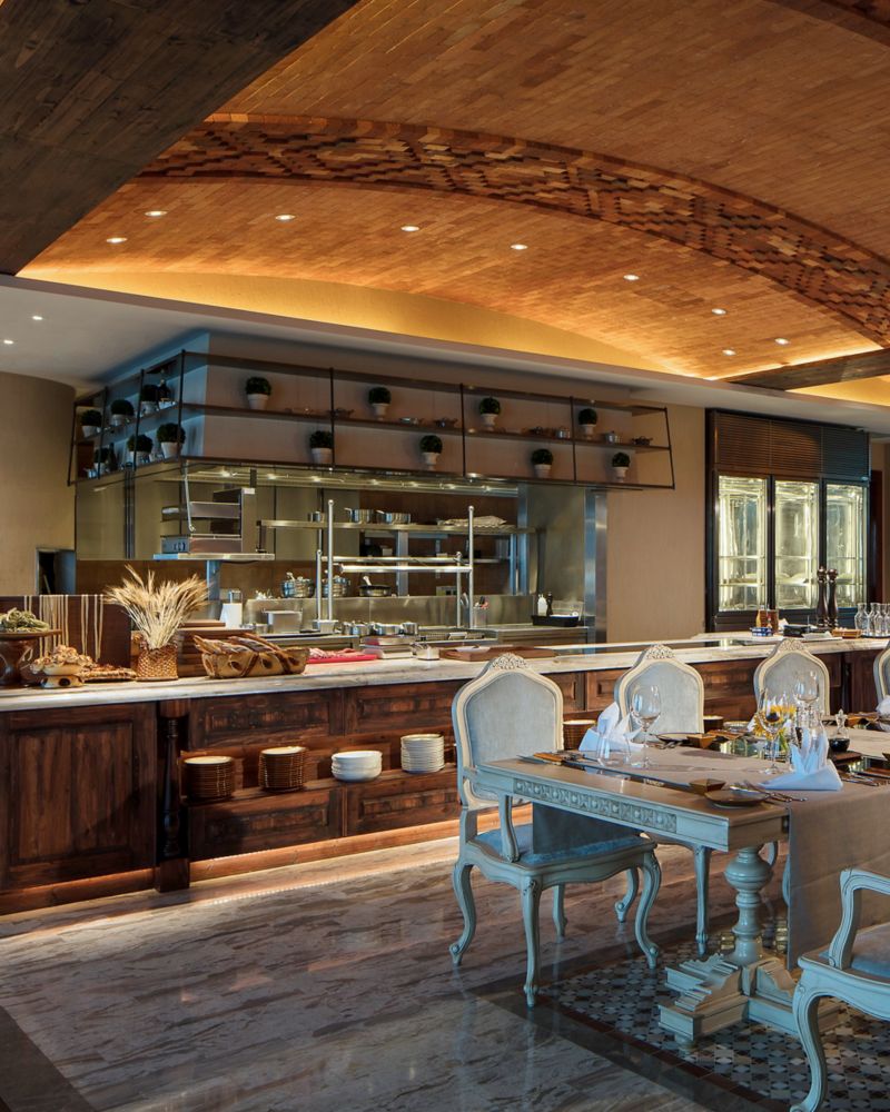 法国餐厅全日餐厅设有4个现场烹饪台,为您带来全新的用餐体验:与我们的主厨愉快互动、从正宗的国际佳肴中感受烹调艺术,乐享极致的生活享受!